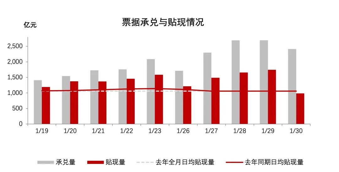一级市场方面,本周日均承兑2362.30亿元,较上周环比增加38.51%;本周日均贴现1418.78亿元,较上周环比增长1.65%;承贴比60.06%,较上周减少21.78%。1月票据市场到期量约3.09万亿元,本月补到期缺口约为5500亿元。