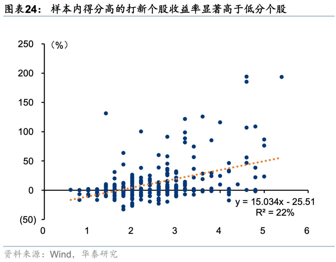 2)样本外部分:考虑到可能存在的过度拟合影响,我们选择样本外数据对模型效果进行检验,发现指标仍保持了较高的有效性。样本外,IPO打分大于2.5的标的平均收益率达41.7%(未筛选时为14.8%),得分高的个股收益率同样较高。