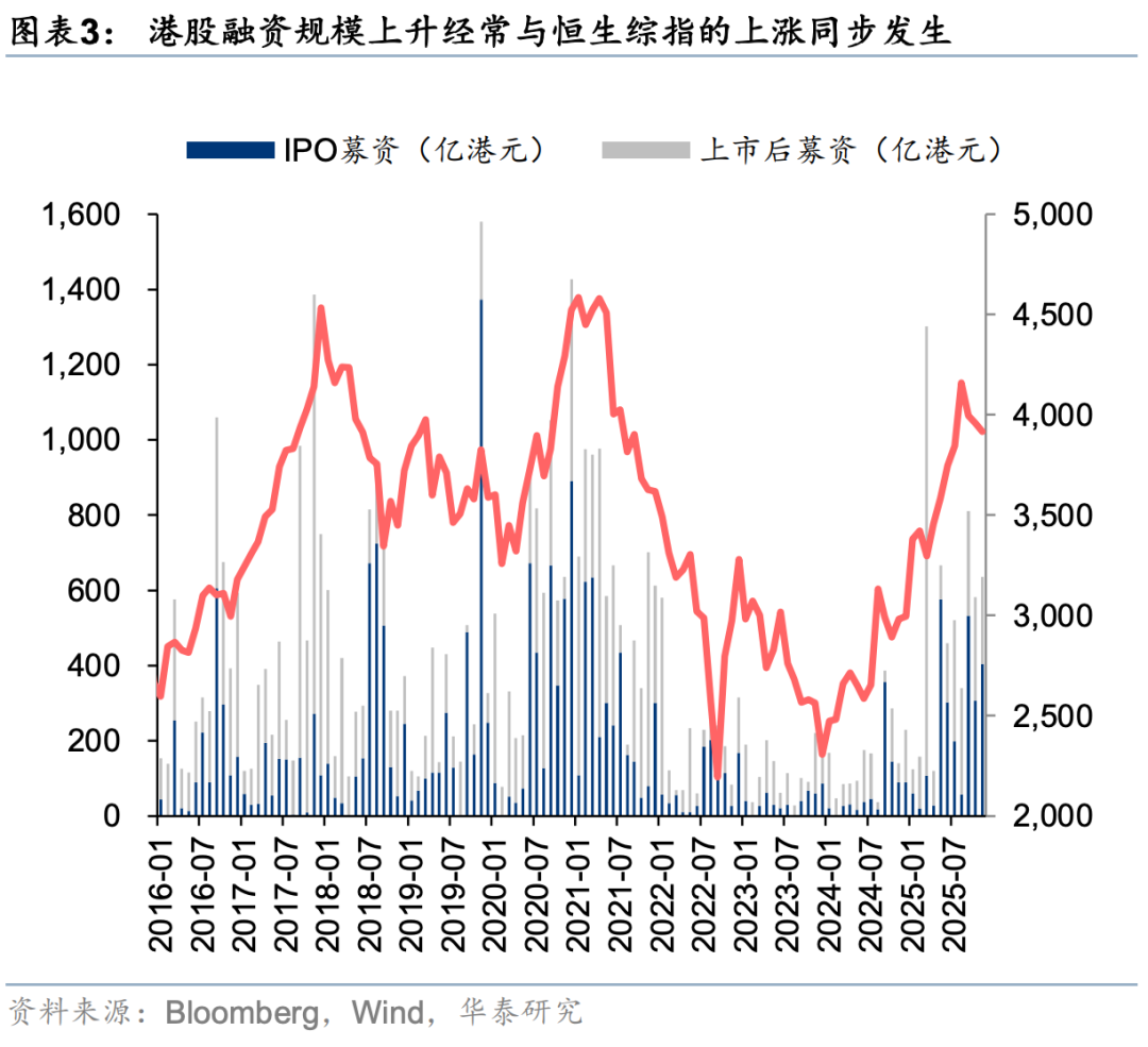 弱美元促进金融条件宽松,提振港股一二级市场表现。美元指数是全球流动性分配的锚,弱美元环境下,投资者往往会减配美国资产而增配全球其他市场的资产,港股是潜在选项之一。外资主要通过在二级市场交易来增配港股,以基石投资者的方式认购则是另一种途径,投资者参与度高往往会提升IPO募资的积极性。从数据看上,港股一级市场的融资与同期的恒生综指表现正相关,两者可能是互为因果。