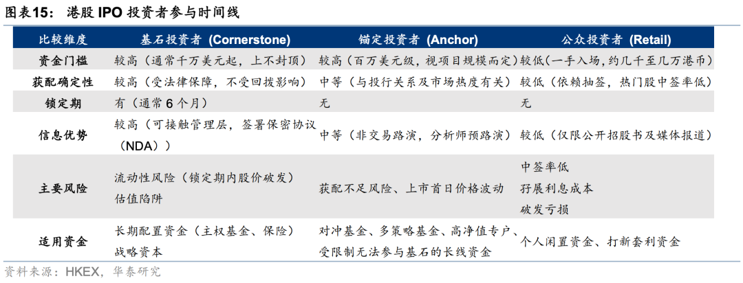 参与港股IPO有基石、锚定和公开发售三种形式,参与资金规模依次递减、灵活性依次递增。1)基石一般最早且较为深入地接触项目,份额受法律保护,但存在锁定期,且由于下单较早,面对发行价不确定性也相对更大。适合长线投资者参加,尤其是参与非常热门需要确保持有份额的项目时。2)锚定在建簿下单前一般已经接触项目,获得了相对充分的信息,且并无锁定期,灵活性更高,但劣势在于获配规模并不由申购规模决定。3)公开发售更多针对零售投资者,了解项目的时间最靠后,是定价的接受者。国内资金可以通过QDI、QDII等合规跨境通道参与,南向暂无法直接参与。