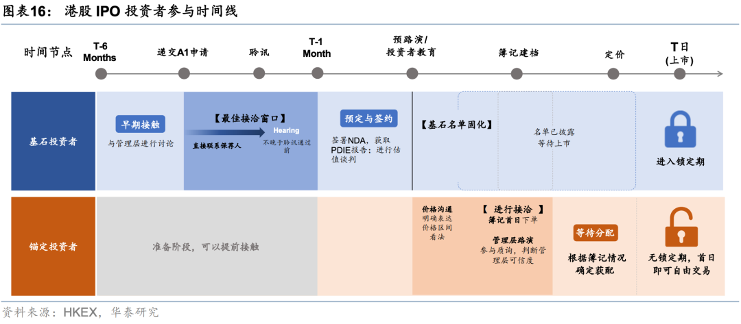 基石投资者的核心优势在于获配的绝对确定性,但代价是必须接受长达6个月的锁定期,且面对更大的发行价不确定性。从时间线看,基石投资者的接洽窗口期远早于其他投资者。有意成为基石投资者的机构一般须在公司递交上市申请后的早期阶段介入,最迟不晚于聆讯通过前。这个阶段包括与保荐人和管理层沟通行业逻辑、进行尽职调查以及谈判估值,所有的基石协议一般在公开发售前签署完毕。一旦签署合约,无论市场超额认购倍数多高,基石投资者的份额会受到法律保障,这为管理大规模资金的机构提供了不受市场热度干扰的入场保障。此外,知名机构作为基石入局能产生“认证效应”,向市场释放看多信号。然而,由于接触项目和下达购入意向最早,基石投资者面对的最终发行价不确定性也最大。6个月的禁售期使得基石投资者必须承担上市初期的市场波动风险。