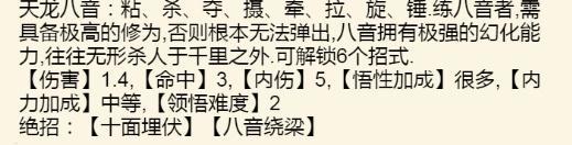 天龙八音包括粘、杀、夺、摄、牵、拉、旋、锤,修炼者需有深厚功力才能施展。此音法幻化莫测,常于无形中制敌于千里之外,威力惊人,修至化境可解锁六大绝招,威震江湖。