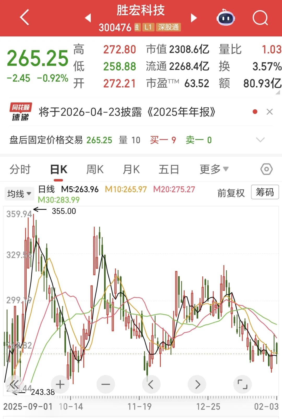 1月16日晚间,胜宏科技发布2025年度业绩预告,公司全年盈利实现大幅增长,但业绩表现未达券商机构一致预期。近期公司股价持续调整,截至2月3日收盘,报价265.25元/股,距离一年之内最高点355元/股,跌幅超25%。