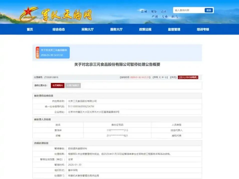 2026年初,北京三元食品股份有限公司同时迎来了两个标志性时刻。一边是十年来的首次年度亏损,预计亏损高达3.56亿元;另一边是旗下公司被暂停全军采购资格两年的行政处罚,原因是提供虚假投标材料。