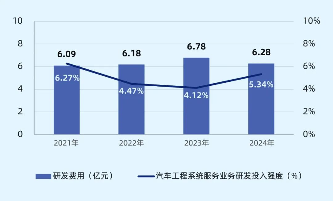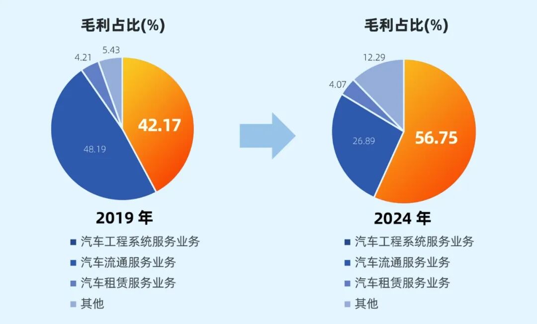 自2019年重组以来,汽车工程系统服务业务的毛利占比已从重组初期的四成提升至2024年的近六成,成为公司利润贡献的核心业务,标志着业务结构实现显著优化与战略聚焦。