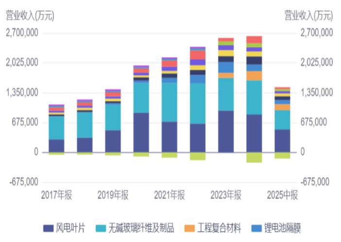 叠加一直以来的研发投入,2025年上半年,玻璃纤维产品均价同比增长14%,风电类产品销售同比增长44%,LFT纱、高模短纤等产品销量稳步增长,其中LFT产品稳居全球市场占有率第一;同时,通过数智化系统推动全流程降本,产品生产成本同口径同比下降6%,成本优势直接转化为盈利动能,仅玻璃纤维业务的毛利率就同比提升11个百分点,达到26%。