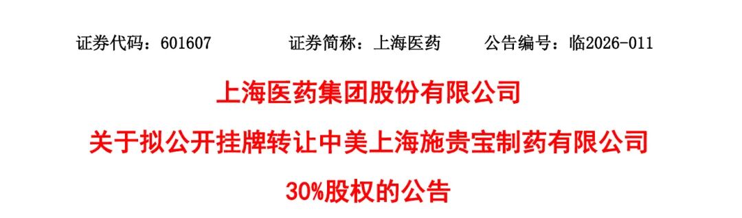 2026年2月4日,上海医药发布公告称,公司拟通过产权交易所以公开挂牌方式转让所持中美施贵宝30%股权,挂牌转让价格不低于10.23亿元,最终转让价格以公开挂牌成交结果为准。
