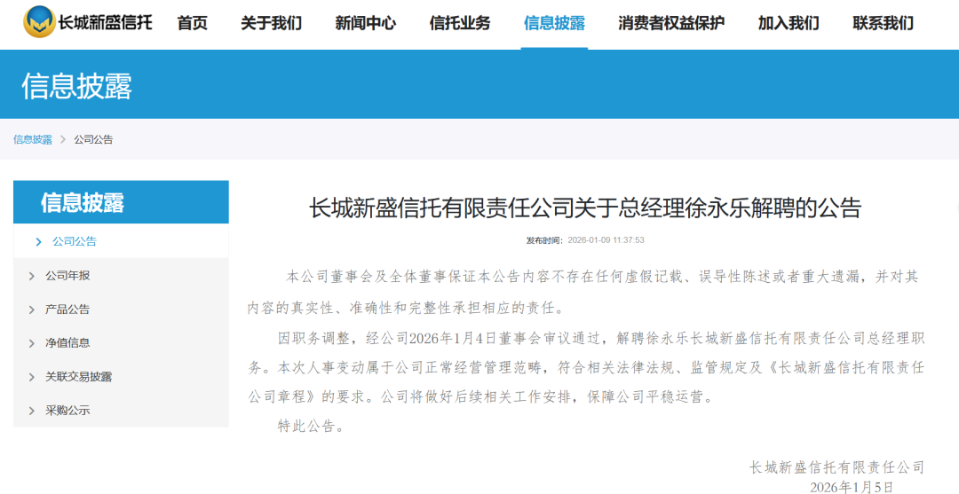 根据公告内容,此次解聘事宜经长城新盛信托2026年1月4日董事会审议通过,核心原因系“职务调整”。公司明确表示,本次人事变动符合相关法律法规、监管规定及公司章程要求,后续将做好各项衔接工作,保障公司平稳运营,未披露更多关于职务调整的具体细节及徐永乐的后续任职安排。
