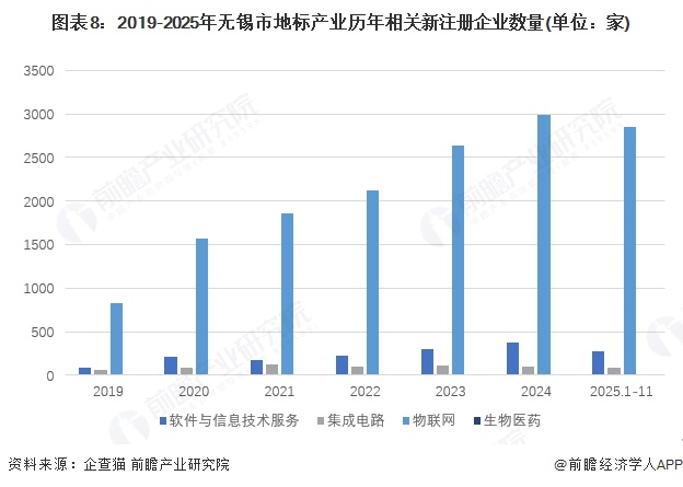 根据企查猫查询数据显示,2019-2025年11月,无锡市物联网企业新注册数量最多,达到17803家,2024年新注册企业数量2985家;生物医药企业新注册数量最少,2024年仅有4家注册。