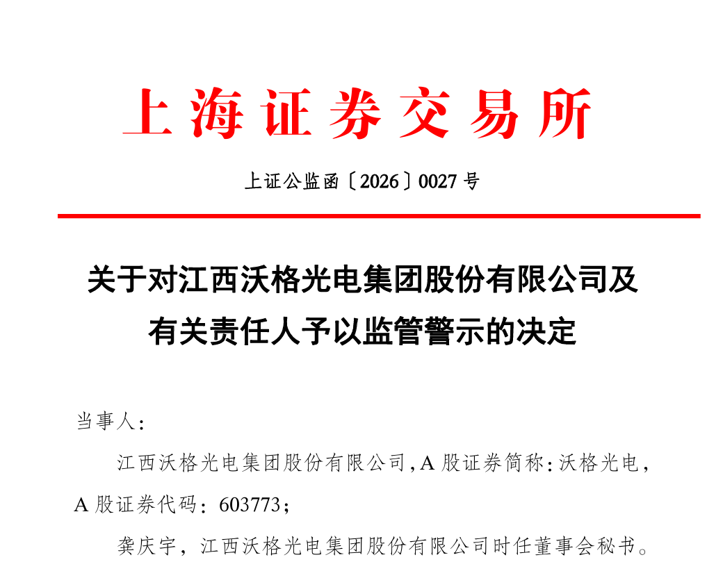 对江西沃格光电集团股份有限公司及时任董事会秘书龚庆宇予以监管警示。