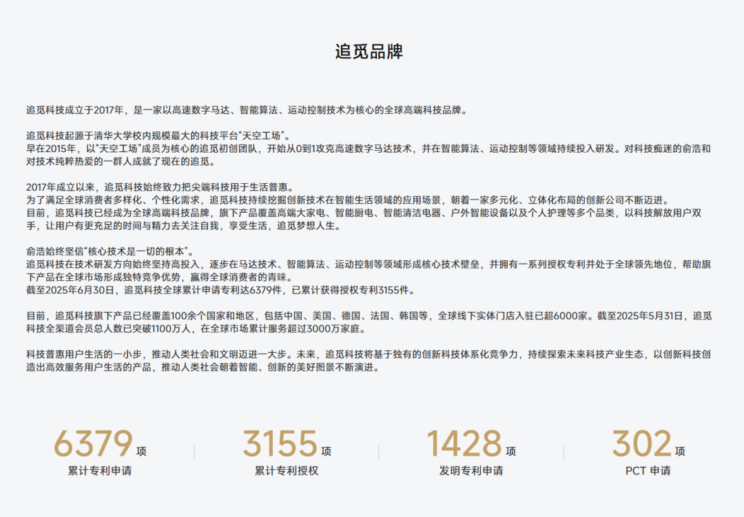 2007年,俞浩成为中国最早的四旋翼无人机开发者,2009年发明三旋翼无人机并创办清华大学极客空间"天空工场"。2015年组建团队研发吸尘器高速数字马达。2017年创立追觅科技并推出首款10万转速高速马达,58%效能超越国际龙头。2018年,俞浩带领追觅开始布局海外市场。公司聚焦智能家电领域,拥有高速马达、多锥旋风分离等全球专利技术,2019-2023年复合增长率超100%。2021年10月,俞浩的追觅获得36亿元C轮融资。2022年5月,俞浩领导的追觅四足机器人团队升级为追觅创新研究院。追觅科技2023年在中国清洁电器市场占有率22.5%,2024年上半年在扫地机器人线上市场份额20.4%,零售额增速居行业首位。产品覆盖全球100余个国家和地区。2025年完成50亿元老股回购,持股比例提升至70%。2025年12月,入主嘉美包装,斥资22.82亿元。