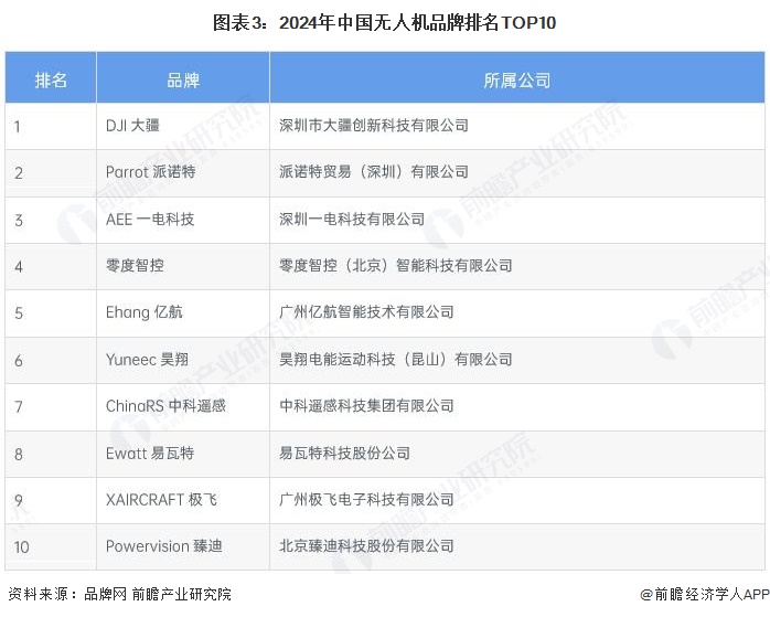 根据品牌网披露的信息,2024年中国无人机品牌排名TOP10分别是DJI大疆、Parrot派诺特、AEE一电科技、零度智控、Ehang亿航、Yuneec昊翔、ChinaRS中科遥感、Ewatt易瓦特、极飞与Powervision臻迪。