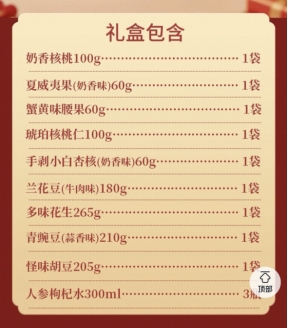 《经济参考报》记者浏览电商平台发现,该商品详情页显示,礼盒包含核桃100g、夏威夷果60g、腰果60g、核桃仁100g、小白杏核60g等坚果类产品,其余为兰花豆、青豌豆、胡豆及饮品等非坚果类产品。