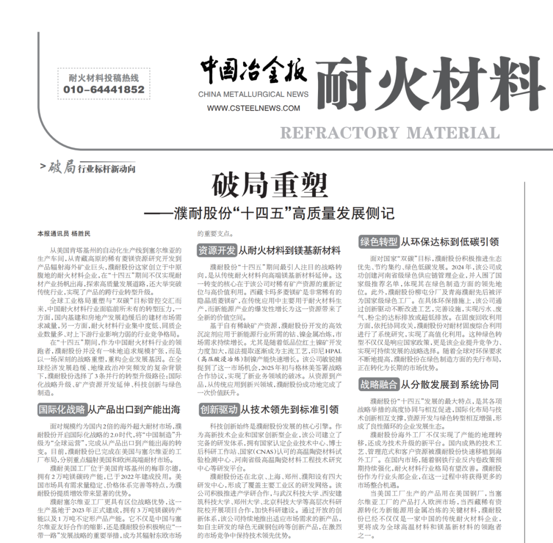 濮耐股份“十四五”发展的最大特点,是其各项战略举措的高度协同与相互促进,国际化布局与技术创新相互支撑,资源开发与绿色转型相互增强,形成了良性循环的企业发展生态。