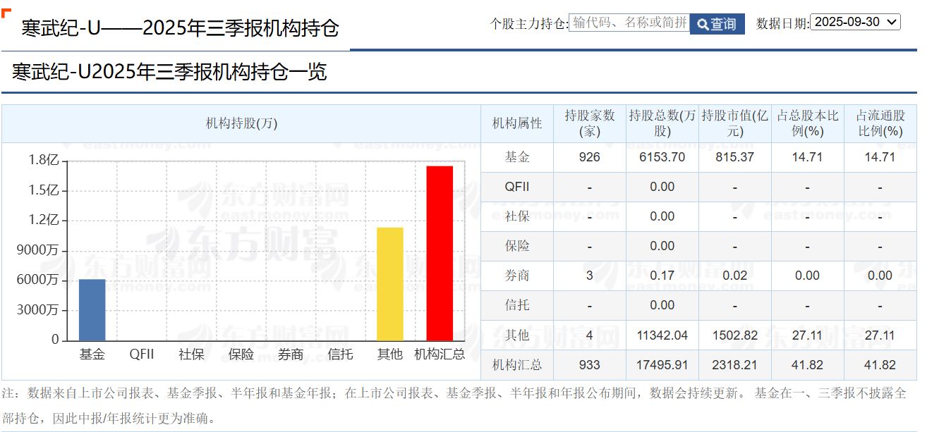 2025年三季度末,共有926家基金持有寒武纪6153.70万股,占比为14.71%。