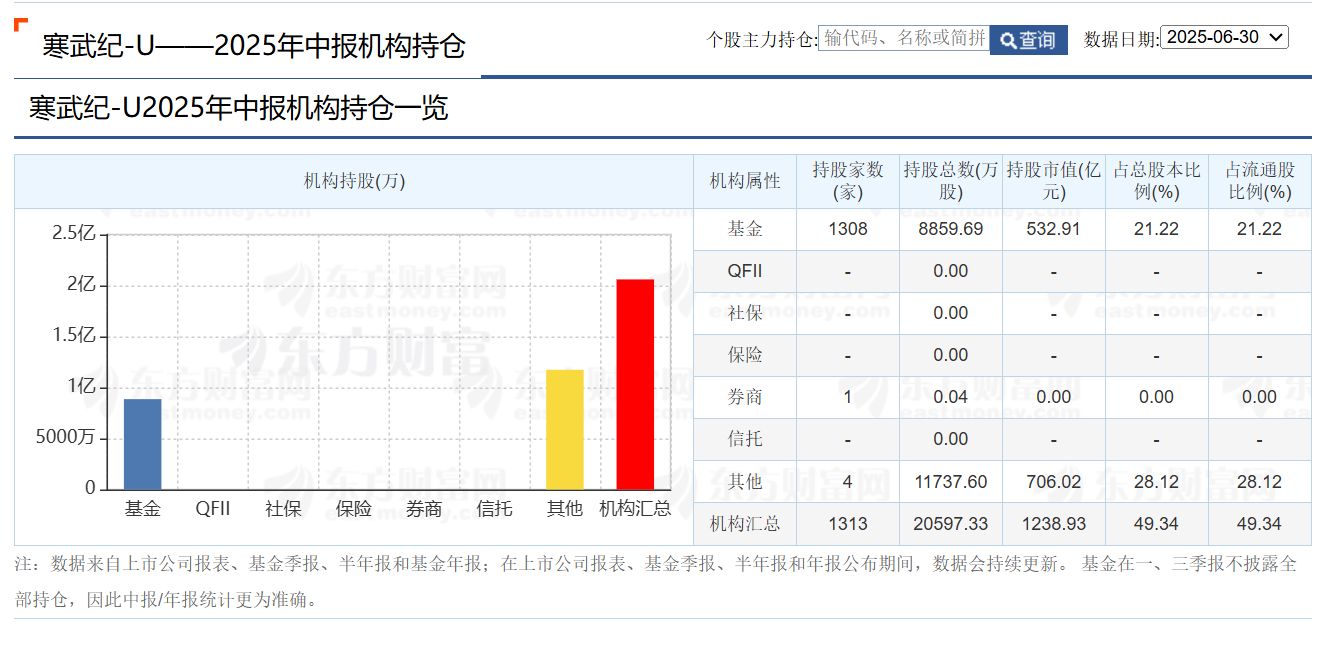 2025年二季度末,共有1308家基金持有寒武纪8859.69万股,占流通股比例为21.22%。