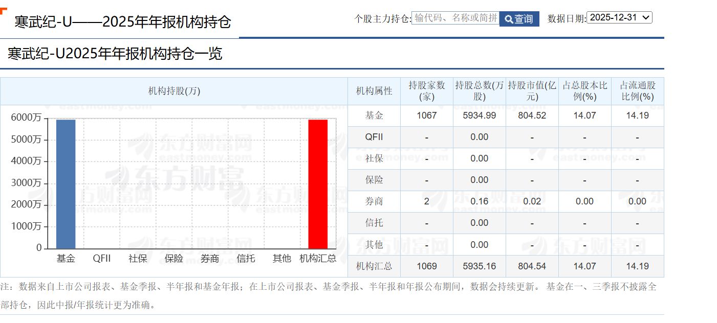最新披露的基金四季报显示,2025年四季度末,共有1067家基金持有寒武纪,但持股总数下降至5934.99万股,占流通比例为14.19%。