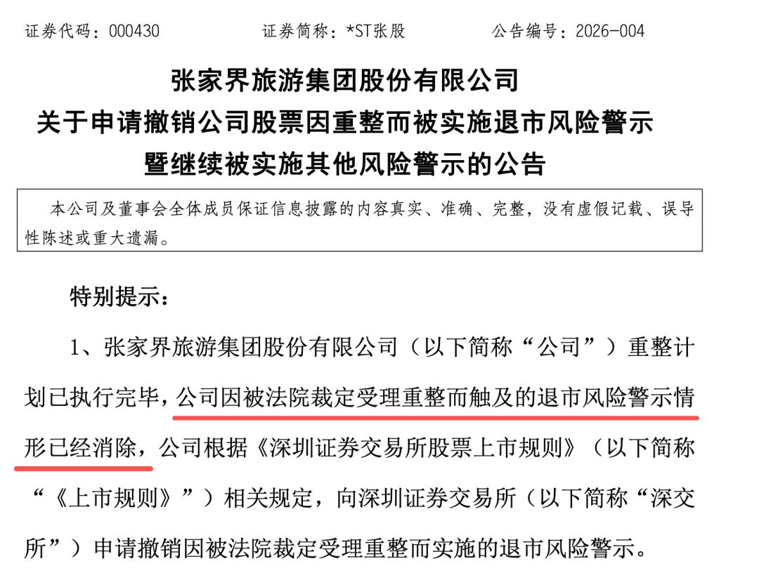 2月5日晚间,*ST张股(000430)公告,公司重整计划已执行完毕,因被法院裁定受理重整而触及的退市风险警示情形已经消除,公司向深交所申请撤销退市风险警示。