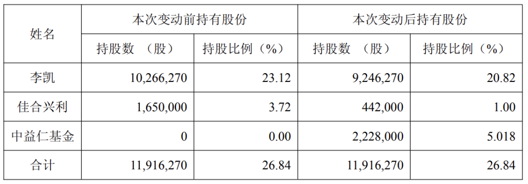李凯及佳合兴利合计拟通过协议转让方式向受让方转让其持有的无限售条件流通股 2,228,000 股(占总股本 5.02%)。