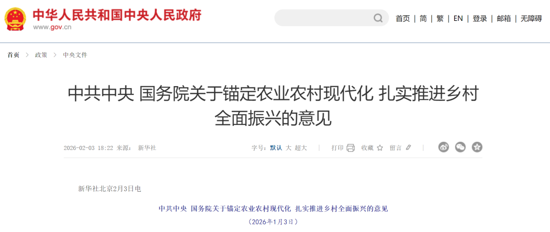 2月3日,《中共中央 国务院关于锚定农业农村现代化 扎实推进乡村全面振兴的意见》发布,这也是“十五五”首个中央一号文件。