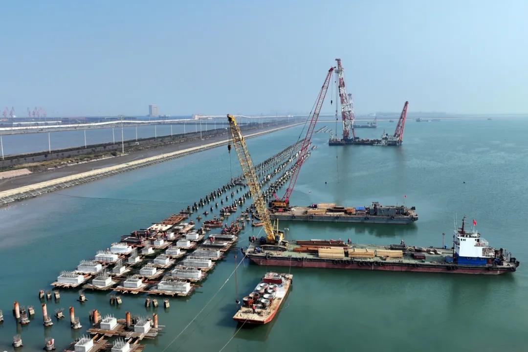 码头区1364根桩基已稳稳扎根海底,321件纵横梁勾勒出坚实骨架