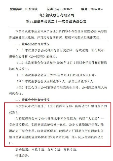 2026年2月5日,山东钢铁发布董事会决议公告,审议通过了《关于能源环保部、能源动力厂整合变革的议案》,为持续提升公司专业化管理水平和创效能力,构建“大能源”一贯制管控模式,实现能源系统管操一体化,决定实施能源环保部、能源动力厂整合变革,将能源环保部、能源动力厂两单位所有职能业务整合至新组建的能源环保部(作为公司直属厂部),同步撤销能源动力厂。