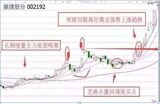 以个股融捷股份(002192)为例,前期长时间缩量盘整,主力在底部区域充分吸筹,后形成金蛤蟆形态。主力震仓洗筹股价回调,右爪芝麻点量的时候出现中期买点,可潜伏。随后股价连续收阳,突破金蛤蟆双眼高位时已奠定了强势的上涨态势,短线速战速决收益颇丰!