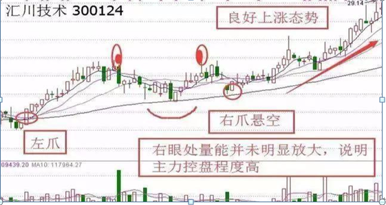 以上图汇川技术(300124)为例,5日线上穿10日线形成金叉,股价在60日均线处开始上涨,K线五连阳将股价不断推高,形成左眼,中途回档,庄家继续建仓收集筹码,触碰60日线后止跌回升。量能并未明显放大的前提下股价再次拉升到右眼位置,说明主力控盘程度高。右爪悬空说明后市走势强势,果不其然最终走出良好的上升形态。