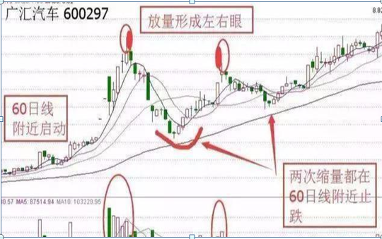 以广汇汽车为例,前期该股长期横盘,在60日附近股价开始启动,形成“金蛤蟆”形态左爪,两次放量上涨形成左眼和右眼。中途两次下跌都是量能皱缩,并且皆在接近60日线时止跌,不碰60日线。在整个形态完成以后,该股股价一路上行。