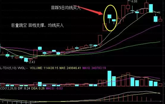 股价脱离底部区域,某一天突然放出巨量,股价跳空而起,随后几天股价开始回踩,等待5日或10日均线慢慢跟上时,股价再次回踩5日或10日均线,投资者可在回踩当天买进,第二天或第三天,通常会以大阳线突破