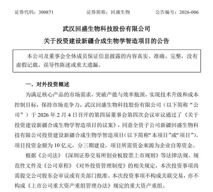 2月5日,回盛生物公告称,公司于2月4日召开董事会,审议通过全资子公司新疆回盛投资建设新疆合成生物学智造项目。