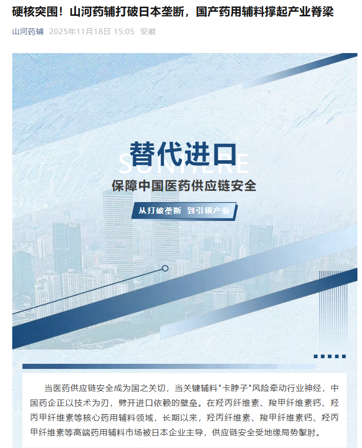 2025年11月18日山河药辅公众号,发表的一篇文章《硬核突围!山河药辅打破日本垄断,国产药用辅料撑起产业脊梁》