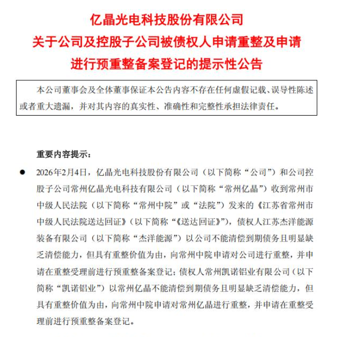 公告显示,2026年2月4日,亿晶光电和控股子公司常州亿晶光电科技有限公司(简称“常州亿晶”)收到常州市级人民法院发来的《江苏省常州市中级人民法院送达回证》,债权人江苏杰洋能源装备有限公司(简称“杰洋能源”)以亿晶光电不能清偿到期债务且明显缺乏清偿能力,但具有重整价值为由,向常州中院申请对公司进行重整,并申请在重整受理前进行预重整备案登记;债权人常州凯诺铝业有限公司(简称“凯诺铝业”)以常州亿晶不能清偿到期债务且明显缺乏清偿能力,但具有重整价值为由,向常州中院申请对常州亿晶进行重整,并申请在重整受理前进行预重整备案登记。