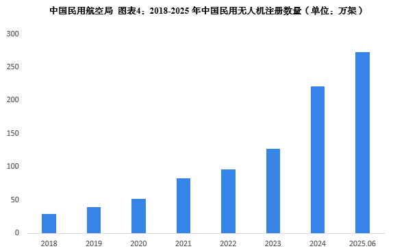 随着我国人均消费水平以及无人机技术水平的提高,公众对智能生活的需求增大,带动民用无人机行业发展,注册数量快速增长。根据中国民用航空局公布的数据,截至2024年底,全行业实名登记无人机共221.3万架,较上年增加94.6万架,同比增长74.7%,而截至2025年6月底,这一数量已达272.6万架。