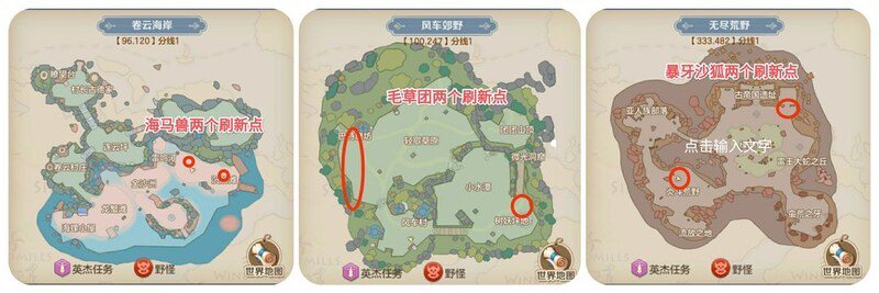 这三种魔兽在地图上有两个刷新点,具有群居特性。经过我通宵观察,确认毛草团与海马兽为24小时刷新,而暴牙沙狐仅在白天出现,夜间不会刷新。