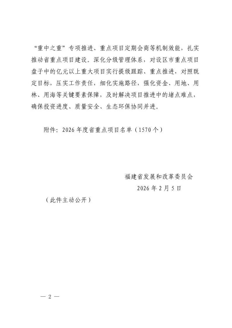 《通知》明确,经省政府同意,确定福建省2026年度省重点项目1570个,总投资4.01万亿元,年度计划投资7226亿元。