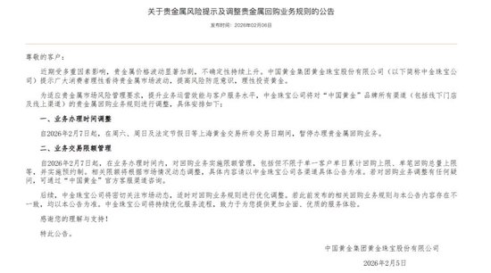 中国黄金在公告中称,近期受多重因素影响,贵金属价格波动显著加剧,不确定性持续上升。公司提示广大消费者理性看待贵金属市场波动,提高风险防范意识,理性投资黄金。为适应贵金属市场风险管理要求,提升业务运营效能与客户服务水平,公司将对“中国黄金”品牌所有渠道(包括线下门店及线上渠道)的贵金属回购业务规则进行调整。