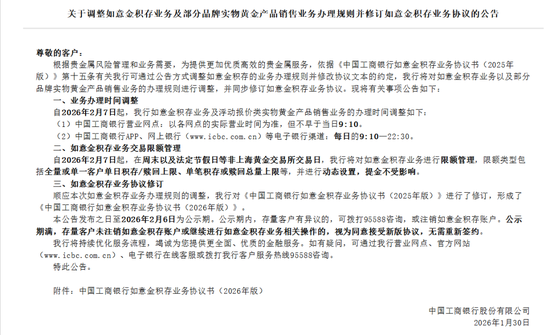 另外,部分银行于近期调整黄金相关规则。其中,中国工商银行自2026年2月7日起,在周末以及法定节假日等非上海黄金交易所交易日,将对如意金积存业务进行限额管理,限额类型包括全量或单一客户单日积存/赎回上限、单笔积存或赎回总量上限等,并进行动态设置,提金不受影响。