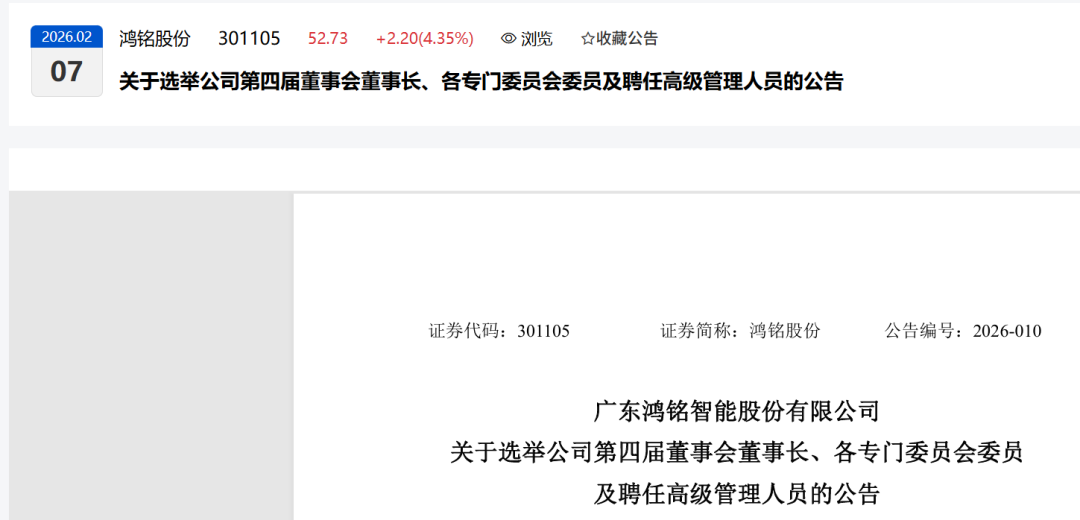 广东鸿铭智能股份有限公司(以下简称 “公司”)于 2026 年 2 月 6 日召开了第四届董事会第一次会议,选举产生了公司第四届董事会董事长、各专门委员会委员,并聘任高级管理人员等,现将相关情况公告如下: