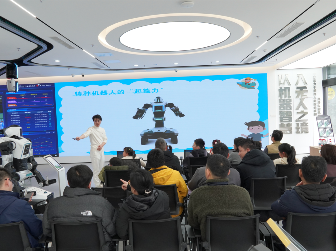 展厅中,在天创机器人虞海波、李雯雯两位员工的讲解下,孩子们详细了解了工业、能源智能巡检运维机器人的功能和作用。