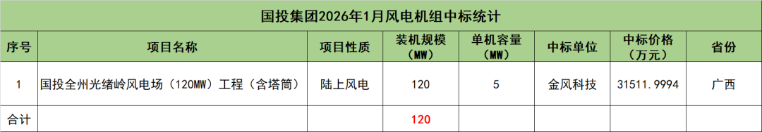 国投集团开标项目共1个,总装机规模为120MW,由金风科技1家整机商中标。