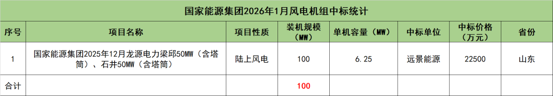 国家能源集团开标项目共1个,总装机规模为100MW,由远景能源1家整机商中标。