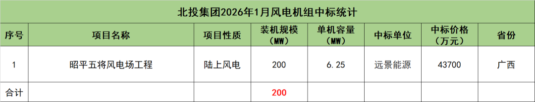 北投集团开标项目共1个,总装机规模为200MW,由远景能源1家整机商中标。