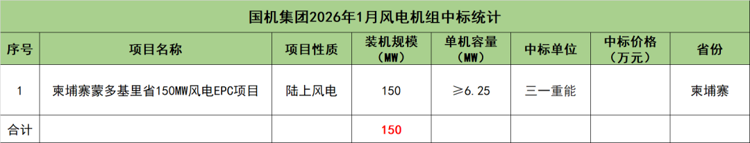 国机集团开标项目共1个,总装机规模为150MW,由三一重能1家整机商中标。
