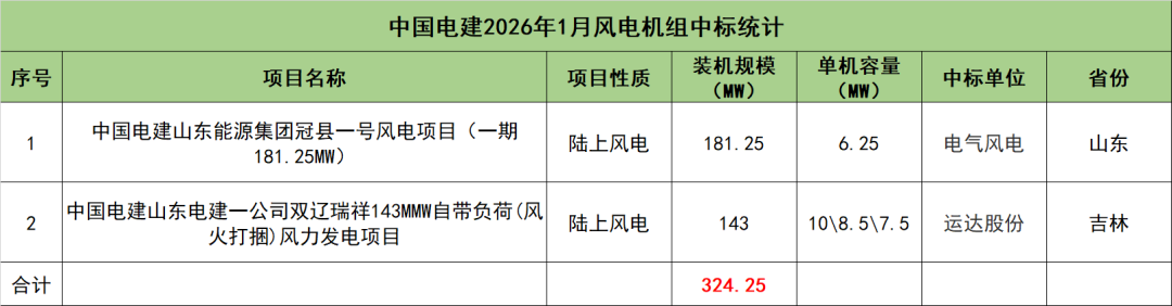 中国电建开标项目共2个,总装机规模为324.25MW,由电气风电、运达股份2家整机商中标。