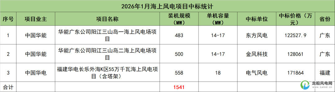 2026年1月份,共有3个海上风电项目开标,总装机容量达1541MW,由东方风电、金风科技、电气风电3家整机商中标。