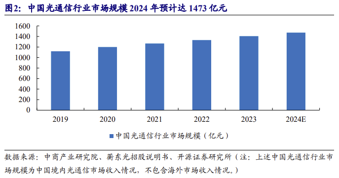 随着云计算、大数据、人工智能等新一代信息技术快速发展,全球数据流量呈 现增长趋势,数据中心建设成为大势所趋。此外,数据中心作为光通信行业的重要 应用领域,近年来在世界主要国家和大型企业数字化转型的带动下发展迅速。据 Dell’Oro Group 发布报告显示,2024 年全球数据中心资本支出增长 51%,达到 4,550 亿美元,预计 2025 年全球数据中心资本支出将增长 30%以上,主要受 AI 基础设施 需求持续增长以及服务器和网络通用基础设施的广泛复苏推动。光通信行业是数据 中心搭建的基础,在下游需求扩张的推动下,其行业将保持稳步增长态势。根据中 商产业研究院数据,2021-2023年我国光通信市场规模分别为1,266亿元、1,331亿元、 1,405 亿元,预计 2024 年市场规模将达到 1,473 亿元,2021 年至 2024 年复合增长率 为 5.18%。