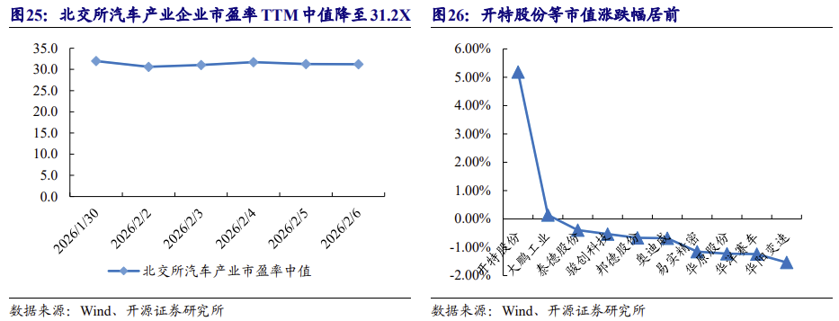 本周,从估值表现看,北交所汽车产业市盈率 TTM 中值降至 31.2X。从本周个 股市值表现来看,开特股份+5.19%、大鹏工业+0.14%、泰德股份-0.39%分列市值涨 跌幅前三甲。(汽车公司类别:包含汽车硬件、汽车电子、汽车整车制造、汽车材料、 内外饰设计、后市场服务等细分行业)
