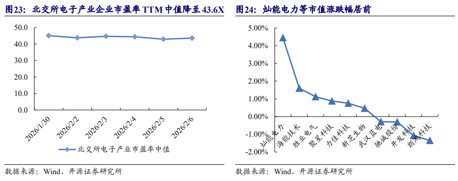 本周,从估值表现看,北交所电子产业市盈率 TTM 中值降至 43.6X。从本周个 股市值表现来看,灿能电力+4.46%、海能技术+1.60%、胜业电气+1.12%分列市值涨 跌幅前三甲。(电子公司类别:包含消费电子、医疗电子、新能源电子设备、仪器仪 表等细分行业)