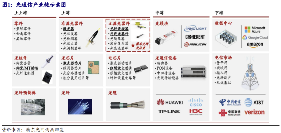 光通信网络由光/电芯片、光器件、光模块、光纤光缆等上游产品组合构建而成。 其中光器件是由各类光组件组成,根据是否需要能源驱动光器件可分为有源和无源 两种,需要能源驱动才能发挥器件功效的为有源光器件,如激光器、光收发器、光 检测器、光放大器、光调制器等;无需能源驱动即可发挥器件功效的为无源光器件, 如光纤连接器、光隔离器、光衰减器等。将光器件与不同功能的光、电芯片密闭封 装形成的产品即为光模块。光通信产业中游主要为设备集成品牌商。光设备由光模 块和光器件组合构成,数据中心、电信机房设备通过光模块实现光电转换,再通过 光通信设备、光连接解决方案实现数据中心、机房设备与城域网、主干网、接入网 的光互联即构成了光通信网络的基本框架。